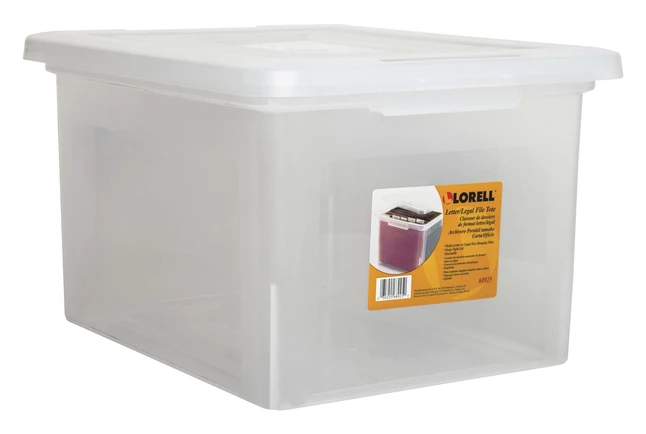 LORELL Clear Stackable Letter/Legal File Box measuring 13-3/16 in x 18-1/4 in x 10-15/16 in is featured with interlocking lid snaps tight for secure stacking of multiple units. Box is ideally used to store letter- or legal-size hanging files.