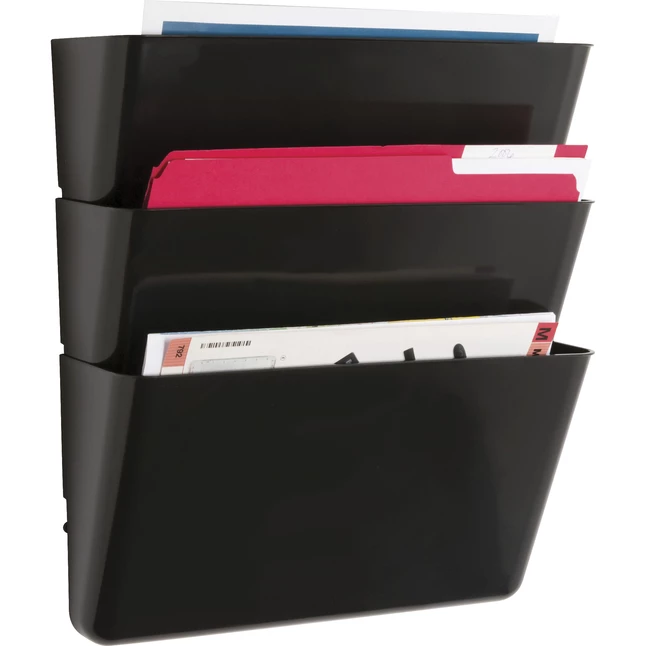 Lorell Mountable Wall File Pocket measuring 13-1/8 in x 4-1/4 in x 14-3/4 in easily nests and mount to walls, doors, partitions or cabinets. More files can be added to optimize the use of small space. Black file pocket includes two screws for mounting and is sold as 3 per pack.