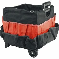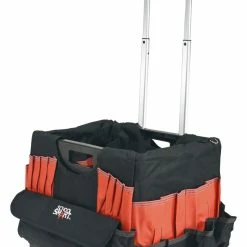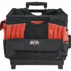 School Smart Folding Storage Cart (measuring 13-7/8 x 11 x 12 inches) is perfect for toting supplies, literature, and books. The cart has a 19-inch telescoping handle and can be reduced to 3-1/4 inches when empty for easy storage. The caddy has durable fabric that slips over the file cart with ease and features 33 external pockets with 10 inside pockets of various sizes to hold your pens, markers, scissors, brushes, and other supplies. Wheels are made of polypropylene. This medium storage cart holds a capacity of 110 pounds.
