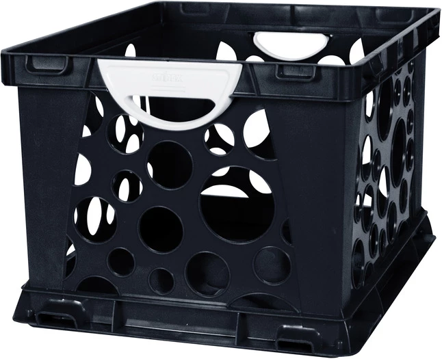 Storex Large Black/White Crate with Handles creates a unique and modular storage solution. Large size of the crate makes it perfect to accommodate letter and legal sized hanging files. 2-Color crate is fully stackable as well as connectable and ideal for school, home or office use. Crate with added design element features a solid bottom that prevents items from falling out. Colors may vary.