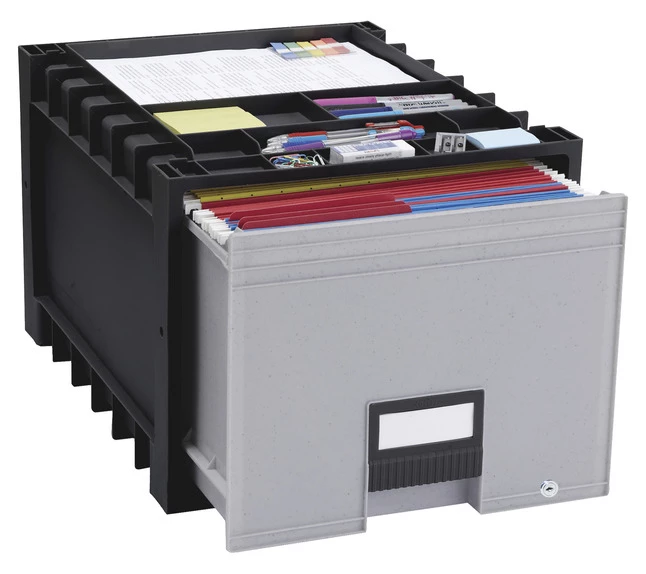 Heavy-duty Archive Drawer with lock is built to maximize on storage in any room. Stackable and water-resistant, the Archive Drawer is a great alternative to cardboard boxes to keep your contents dry and easily accessible. The sleek black and gray colors match everywhere from office to garage. Built-in label holder and reinforced handle make finding and grabbing the right item quick and easy. Included with each drawer are vertical connectors so you can stack drawers up to 10 units high. The drawers are made with post-consumer recycled materials for a more sustainable product.