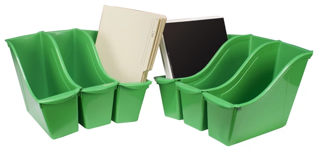 Keep your books organized and within easy reach. Link our book bins together to make a sturdy book storage or use the easy to grip handles to carry a set of books to your reading corner. The handles are perfectly sized for big and small hands. Fits narrow 12 inch bookcases. The bin will fit taller books and letter sized file folders too. Entire bin measures 11-3/4 L x 8-1/2 H x 4-1/2 W inches. Label pockets not included. Bright colors are ideal for STEM or STEAM organization. Colors may vary.