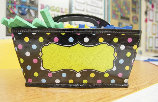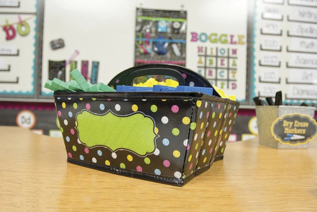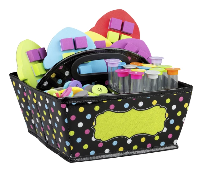 This cute storage caddy is a handy tote for your markers, calculators, timers, manipulatives, and many more small items that you want to keep within reach. Open or close the flexible divider to make one side into two separate compartments.